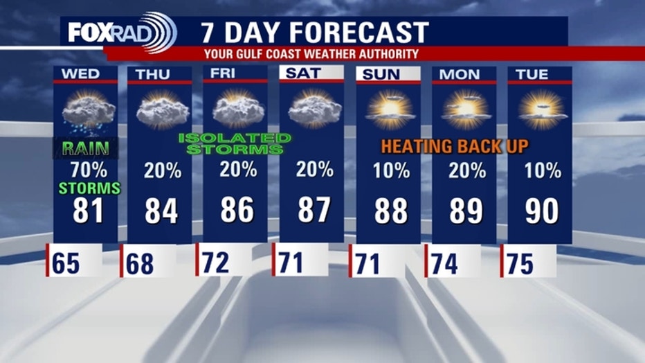 Rain chances begin to decrease late this week, but humidity builds back in.