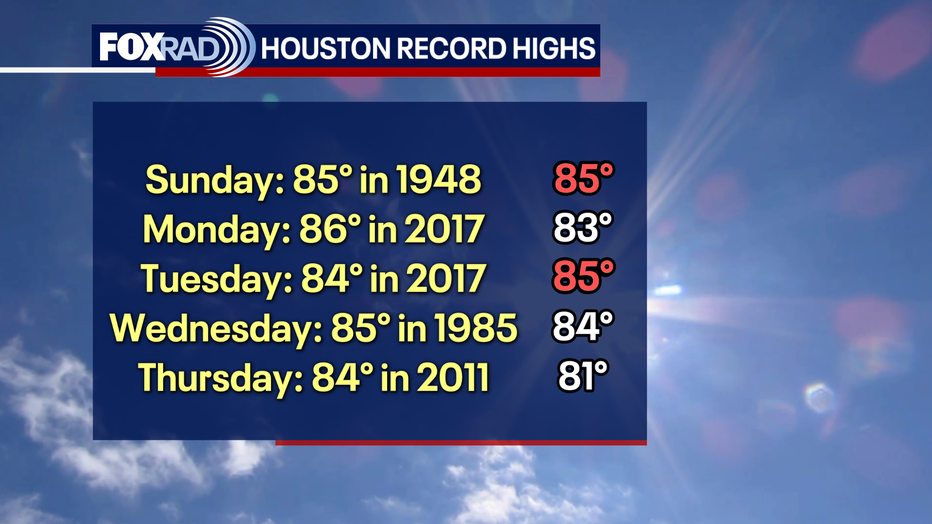 HOUSTON - Houston set a record-high temperature for Sunday afternoon. The warm trend is expected to hold through the start of the week. More daily record highs are in jeopardy especially on Tuesday. We are within a few degrees of each daily record high for the next few days.