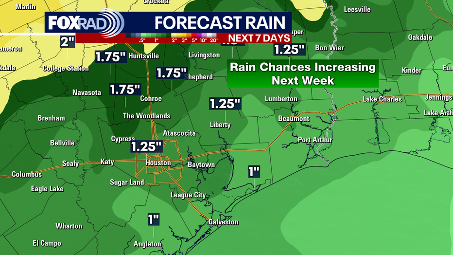Nearly our entire viewing area is in some sort of drought risk. Widespread severe and moderate drought levels persist from Fort Bend, Harris, Liberty, Chambers and Galveston counties among many more. Areas should get some relief in the near future - models suggest about an inch or two of rain to fall across much of the area in the next seven days.