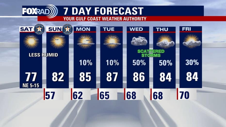 HOUSTON - Saturday's weather will be a little bit cooler as a weak front has moved into the area, causing a slight drop in temperatures and drier air. However, conditions will still be comfortable with more sun in the afternoon.