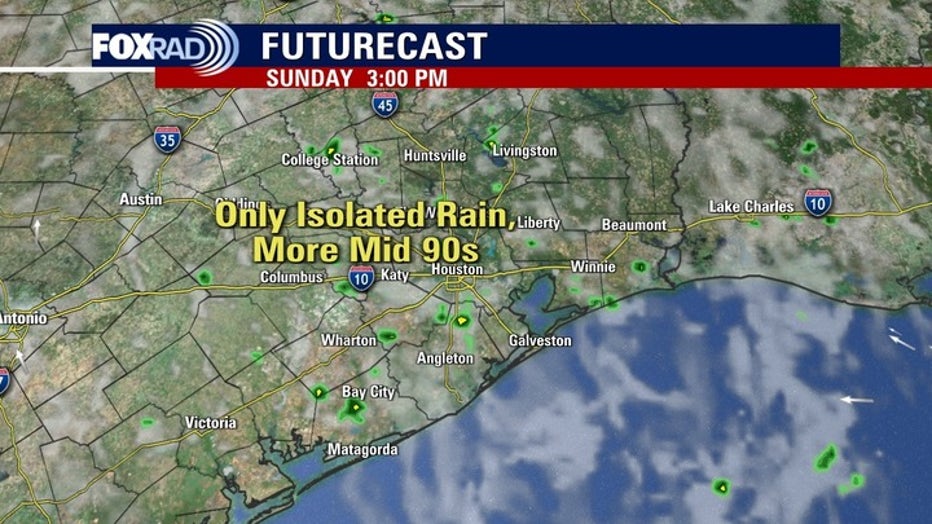 High temperatures in the mid to low 90s and overnight lows in the 70s. Look for only a 20% chance for rain on Sunday.