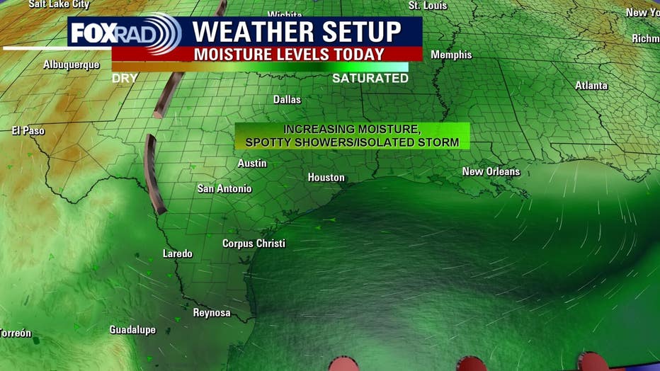 A shift in wind direction has returned muggy air to most areas and will also bring some scattered showers today. Areas north of Houston should stay drier for one more day, but from I-10 southward, showers and a possible isolated storm are possible from late morning through the afternoon.