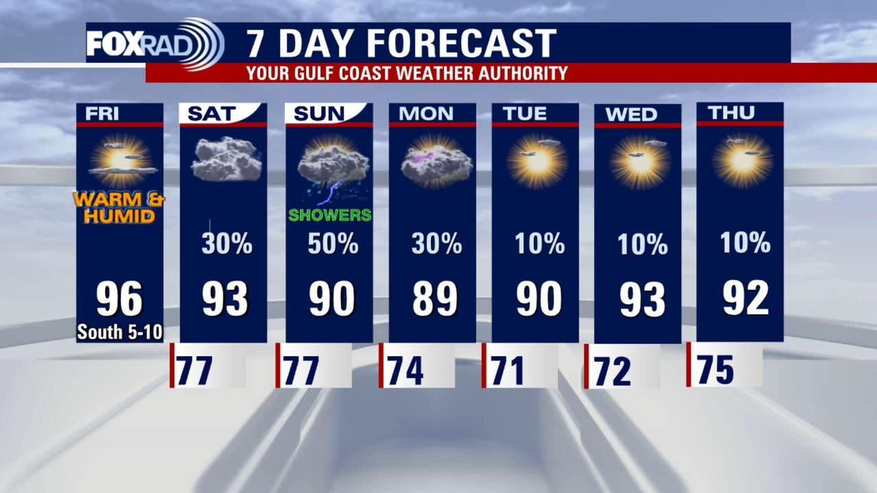 Friday is looking a bit more humid with late summer heat bringing highs in the mid to upper 90s. Overall rain chances remain low, meaning great weather for Friday Night Football.