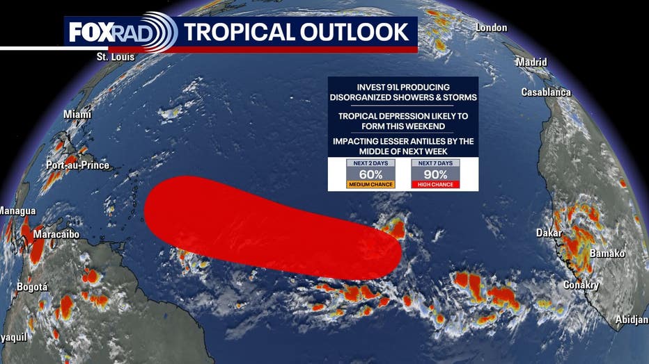 A tropical wave in the eastern Atlantic, now Invest 91L, has a high chance for development over the next week.