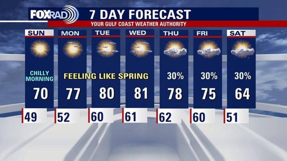 Nights stay mild, and the extended outlook remains dry until Thursday and Friday as a front moves in and brings cooler air for the Houston Marathon weekend.