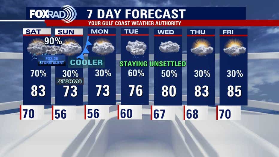Southeast Texas stays warm, humid, and breezy through Saturday afternoon with highs in the 80s and south winds around 10–20 mph with higher gusts. Rain chances remain low for your Friday night plans. But look for showers and storms to gradually increase throughout the day on Saturday, with the worst of the heavy rain late Saturday night. Late Saturday through early Sunday morning is when Houston will be under a FOX 26 Storm Alert. There's a risk for heavy downpours that could lead to a few flooded streets and some strong storms.