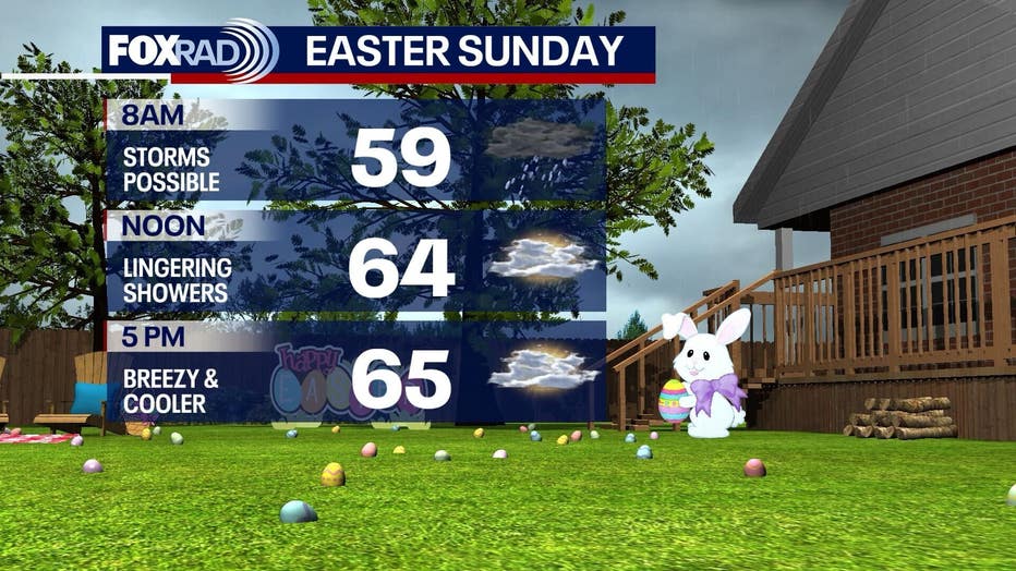 Showers and storms may linger into Easter Sunday, with the best chance early in the day. Expect muddy grass and wet morning, with improving conditions possible later in the afternoon.