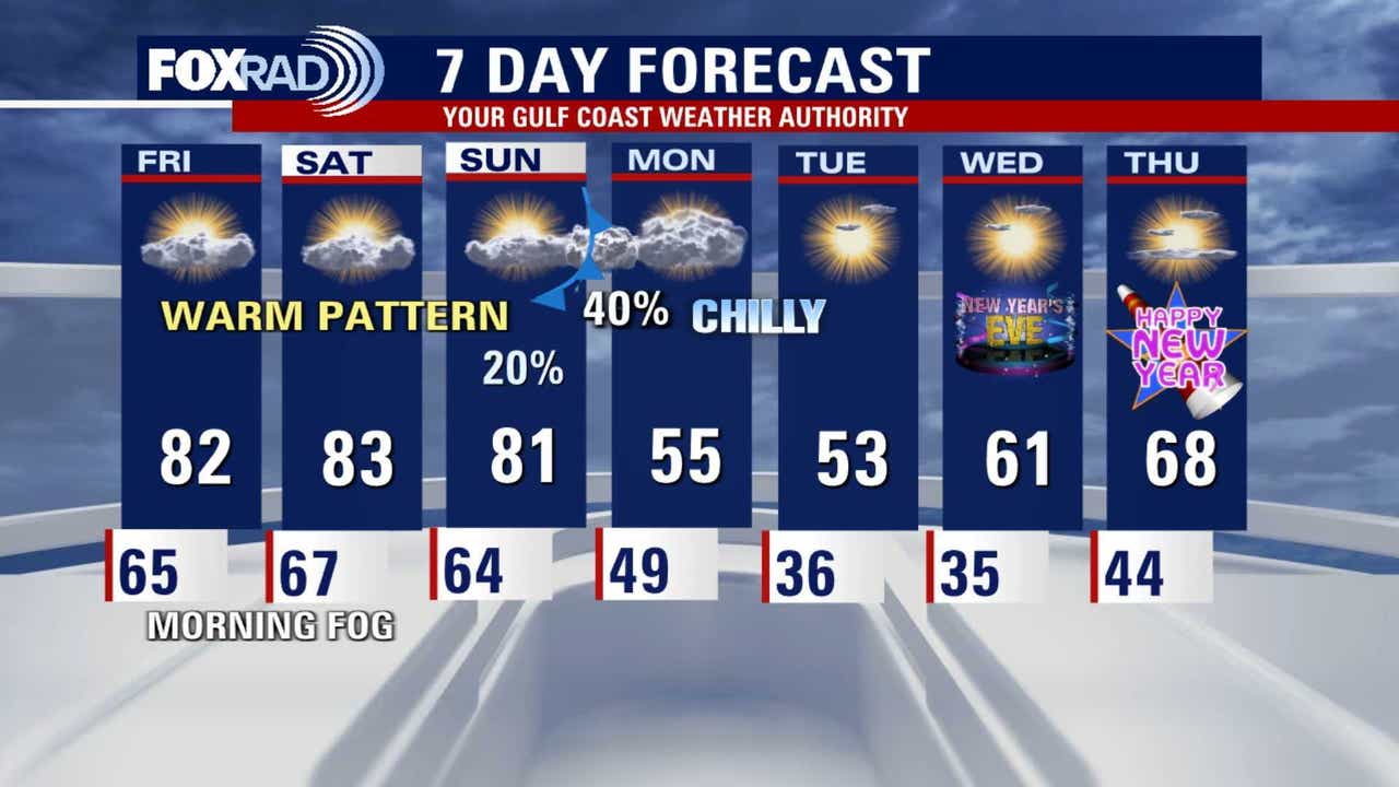 The unseasonably warm setup continues through the weekend. Light Gulf breezes keep temperatures well above average, and humidity stays elevated, giving the air a spring-like feel until a cold front late Sunday.