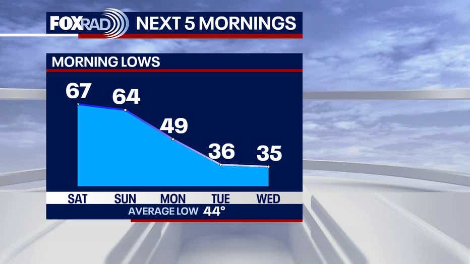 For now, plan on colder air beginning Sunday night with lows in the 40s (possible 30s) each night and highs only in the 50s Monday and Tuesday.
