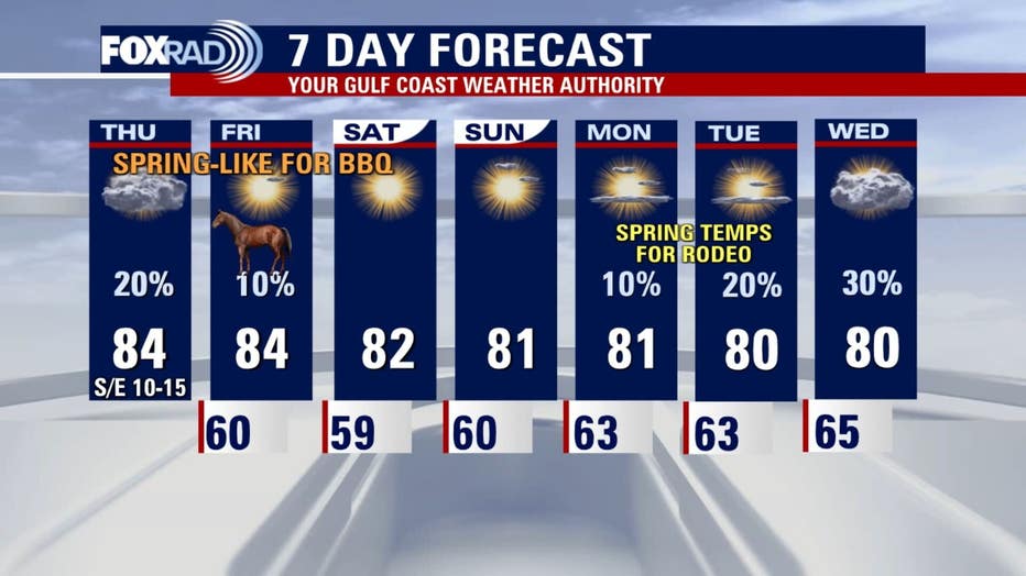 We'll have a sunny and breezy Thursday, a pleasant day to kickoff the Houston rodeo World’s Championship Bar-B-Que Contest. Temperature highs will reach the mid-80s.