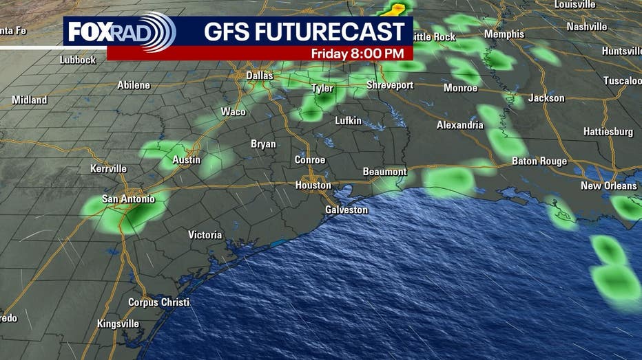 Conditions remain favorable for outdoor events, including the World’s Championship Bar-B-Que Contest and Friday’s Go Texan Day, but there is a chance for a few sprinkles, otherwise just unseasonably warm.