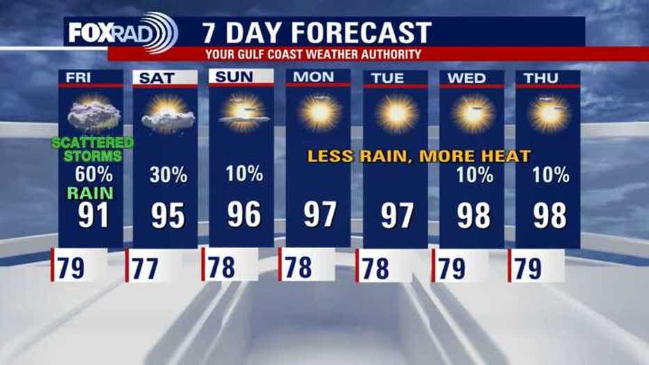 Sunday through next weekend are looking mostly sunny and rain-free with daily highs in the mid to upper 90s.