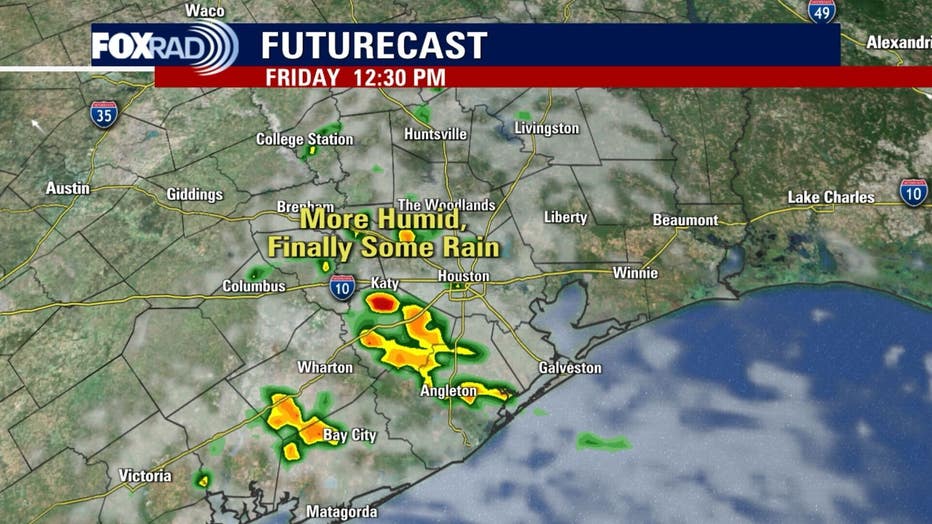 Gulf breezes will return late today bringing a gradual rise in humidity. By Friday and Saturday, this added moisture will help trigger scattered showers and storms — offering the best chance in weeks for meaningful rainfall across the area.