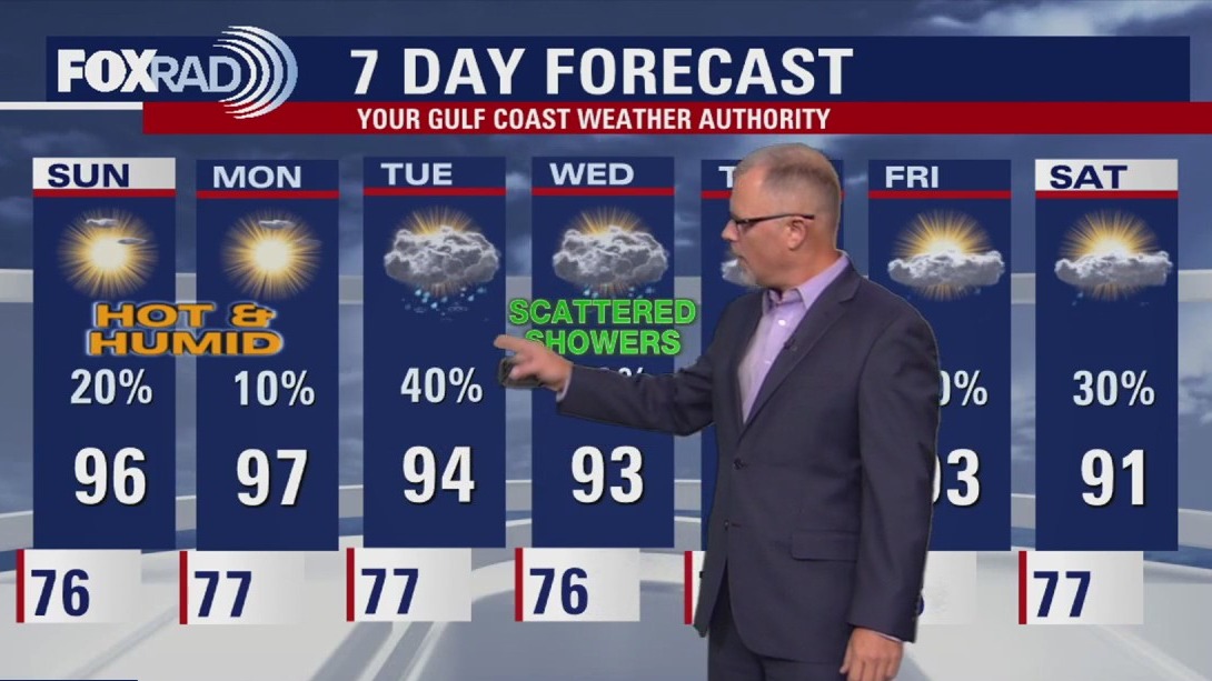 Models show lower rain chances Sunday and Monday. With that comes plenty of sunshine helping temperatures rise to the upper 90s on Sunday.