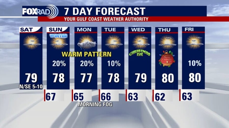 This weekend and through Christmas week, afternoon temperatures climb well above average, into the 70s and 80s.