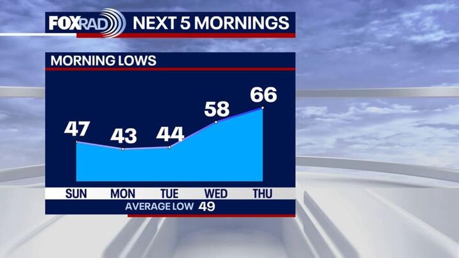Behind this front, we can expect three chilly mornings Sunday through Tuesday before a warming trend returns later next week. Temperatures will dip to the upper 40s Sunday morning followed by a drop to the low 40s Monday and Tuesday morning.