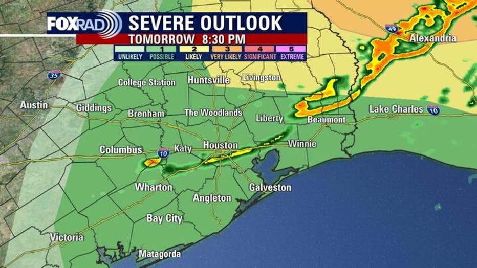 There's a low 1/5 risk for a few severe storms Sunday evening and Sunday night for Houston, with a slightly higher 2 out of 5 risk clipping parts of Walker, Polk & San Jacinto counties.