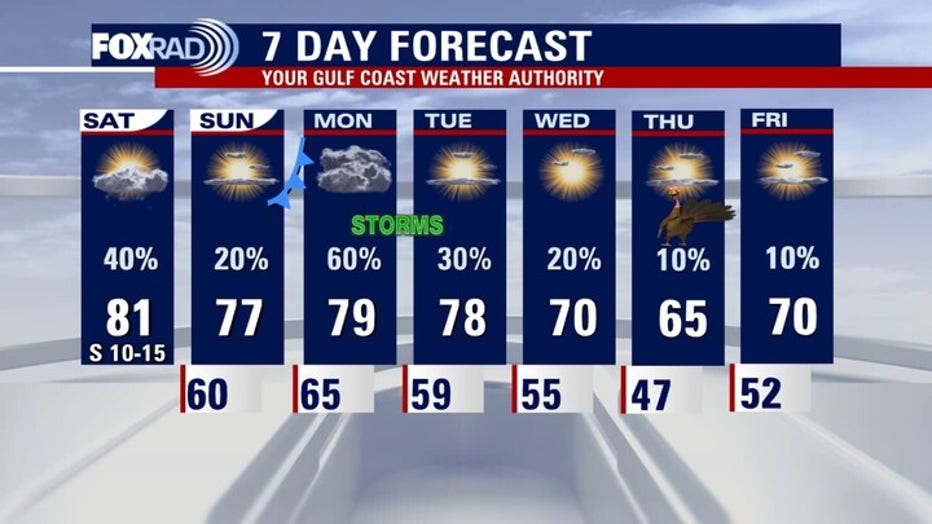 After Monday’s potential disturbances, most of the Thanksgiving period appears drier and feeling much more like the holidays with lower temperatures and lower humidity. Expect highs in the 60s for Thanksgiving and seasonably chilly air into the long holiday weekend.