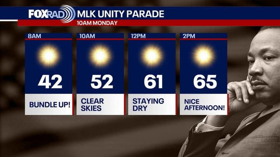MLK Day is forecast to be dry with nice afternoon temperatures. It will be a chilly start to the MLK Unity Parade, but skies remain clear.