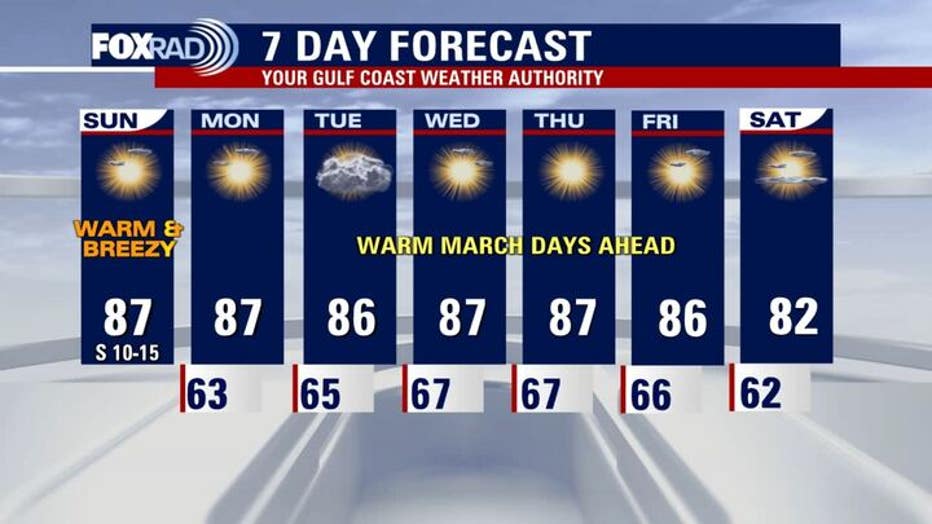 Temperatures will climb again on Sunday. The record for Sunday is 89 degrees.