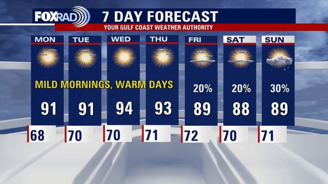 Early mornings will dip into the 60s inland, with coastal areas staying slightly warmer. By afternoon, highs should top out near 90, but lower humidity keeps things feeling comfortable most of the day.