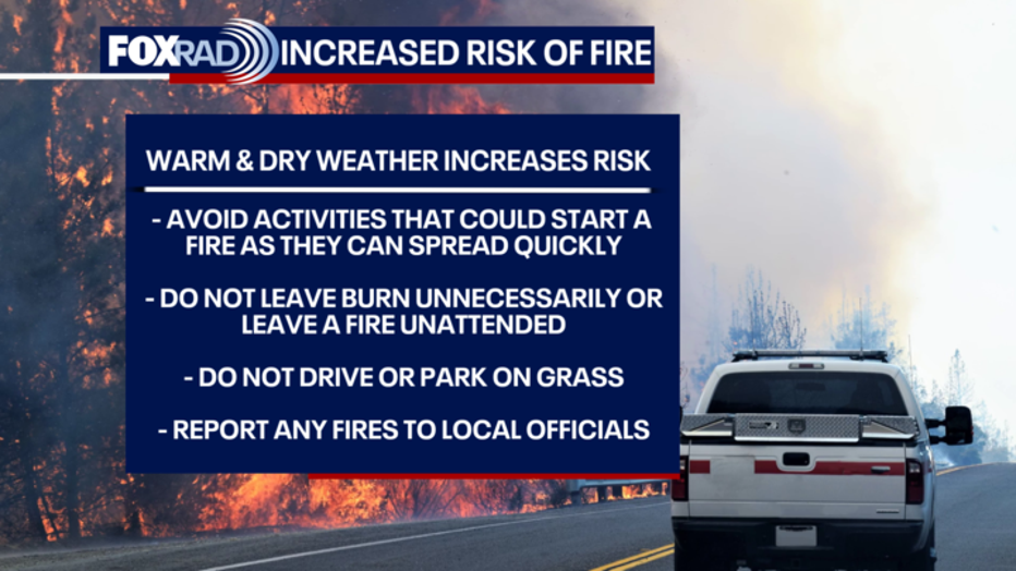 Lower humidity decrease our chances of rain but increase our risk for fire danger. Avoid activities that could start a fire, never leave a burn unattended, and if you see a fire report it to law enforcement.