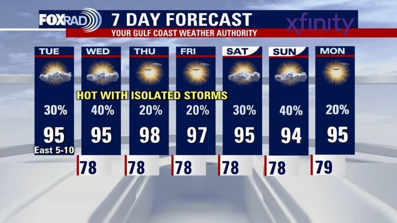 You may see a few morning showers, but as we move into the afternoon expect sunny skies and hot temps in the mid-90s. There is a chance of isolated afternoon storms. Plus, we have some things happening in the tropic as Tropical Storm Dexter forms.