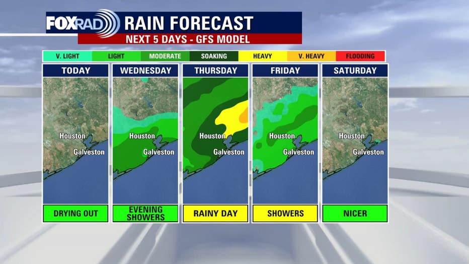 There is a chance for isolated street flooding, especially for coastal counties on Thursday. Showers are expected through at least early Friday, then we'll have some welcome clearing.
