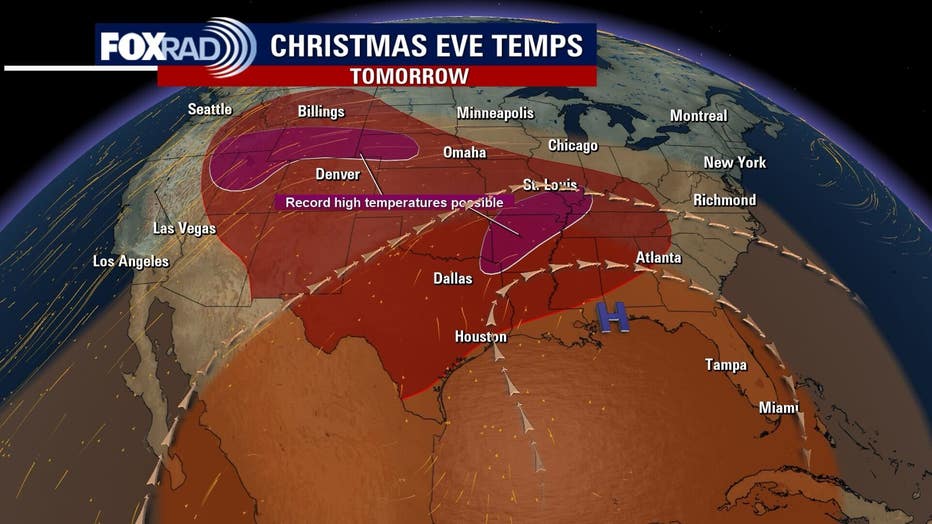 The unseasonably warm pattern continues through Christmas Eve and Christmas Day. Gulf breezes and elevated humidity keep temperatures well above normal, giving the holiday a springlike feel rather than a winter one.