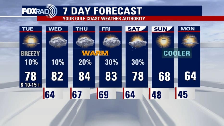 After a cool, foggy start, we'll transition to a partly cloudy and breezy day. Temperatures are expected to climb into the upper 70s, making for a very mild afternoon. You'll notice a steady breeze coming in from the Gulf, with gusts occasionally reaching the 20 mph mark through the day and into the night.