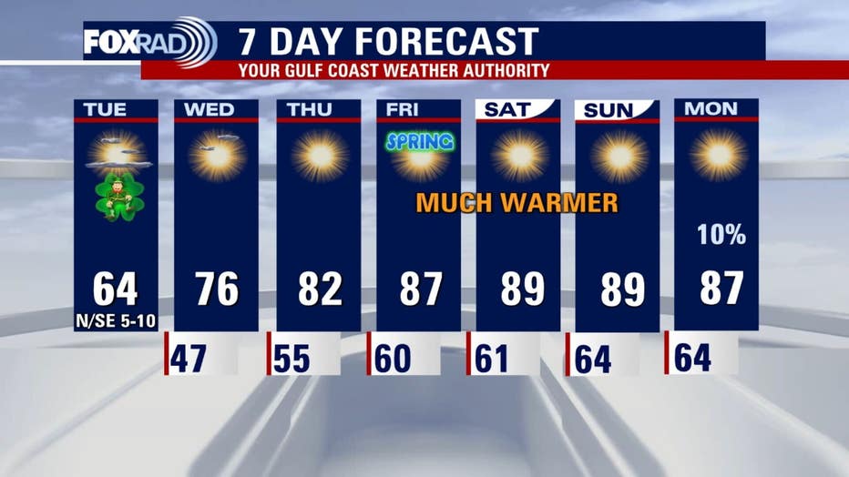 If you were hoping for a warm St. Patrick's Day, you're unfortunately out of luck! It will be sunny, but chilly with temperatures below average and highs reaching into the mid-60s.