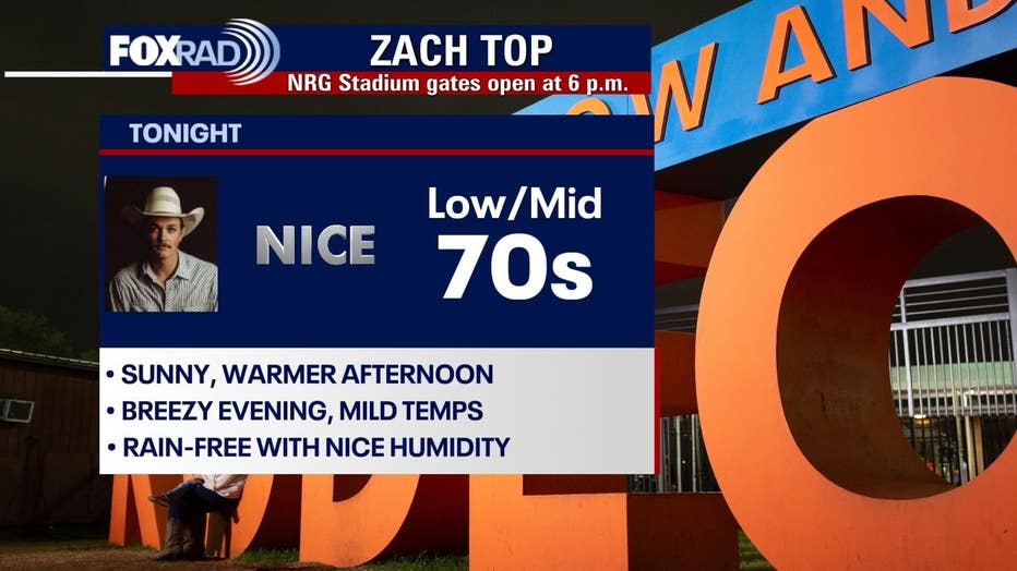 Following a cool start this morning, Houston will enjoy sunny skies, pleasant afternoon temperatures, and low humidity today. Weather is looking great for the rodeo carnival and going to the Zach Top show tonight.