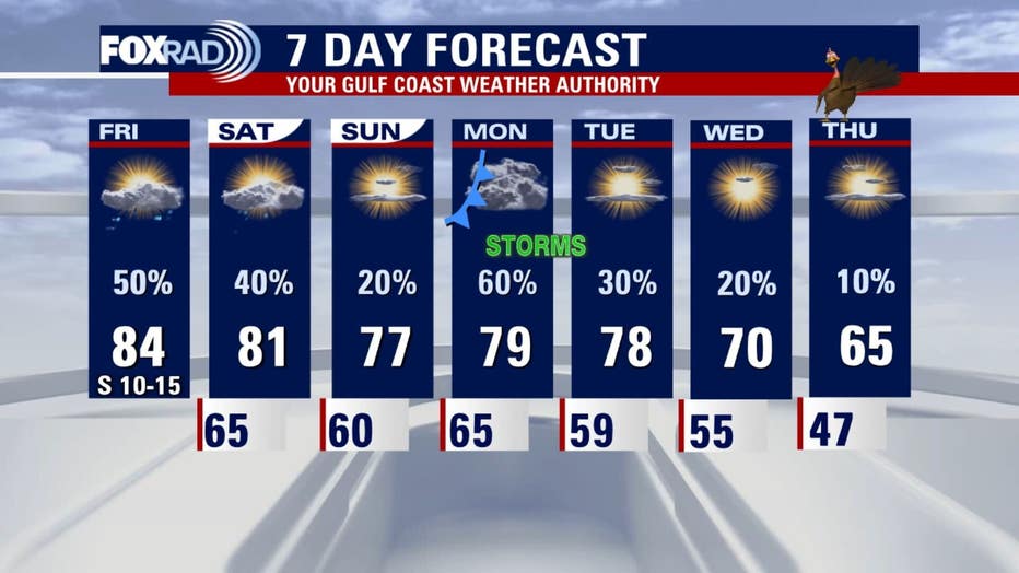 Heading into the holiday week, after Monday, the trend looks favorable for travel and outdoor plans. After Monday’s potential disturbances, most of the Thanksgiving period appears drier and feeling much more like the holidays with lower temperatures and lower humidity. Expect highs in the 60s for Thanksgiving and seasonably chilly air into the long holiday weekend.