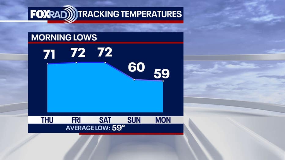 Behind the front, temperatures drop back into the mid 70s early next week with a slight dip in humidity. We may also be in store for light jacket weather by Monday morning as many areas dip to the 50s. Conditions turn quieter for a time before gradual warming & with better rain chances later in the week.