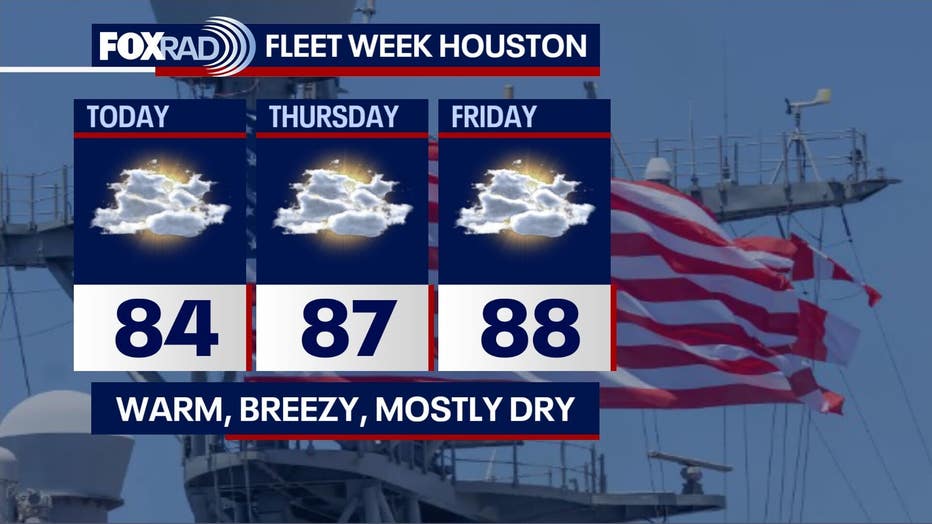 HOUSTON - It is expected to be a pleasantly warm day with sun and some clouds. Rain chances are low, which is good for the start of Fleet Week Houston.