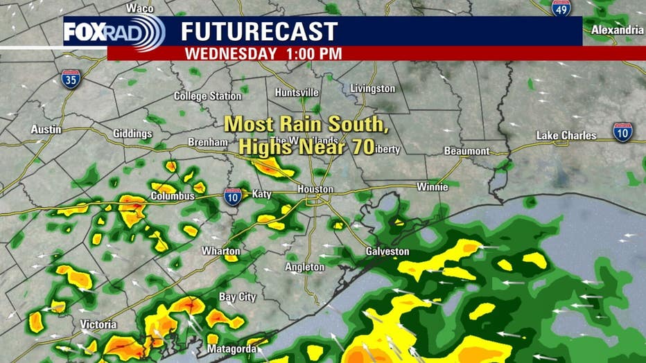 HOUSTON - Expect some off and on rain on Wednesday throughout the morning and early afternoon. Temperatures will be warmer than they were yesterday with highs reaching near 70.