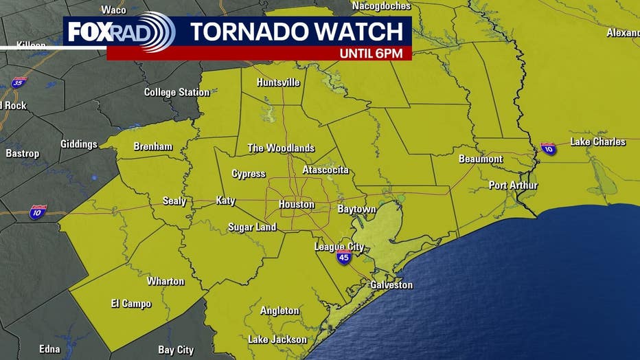 The National Weather Service has issued a tornado watch until 6 p.m. for Austin, Brazoria, Chambers, Colorado, Fort Bend, Galveston, Grimes, Harris, Houston, Liberty, Montgomery, Polk, San Jacinto, Trinity, Walker, Waller, Washington and Wharton counties.