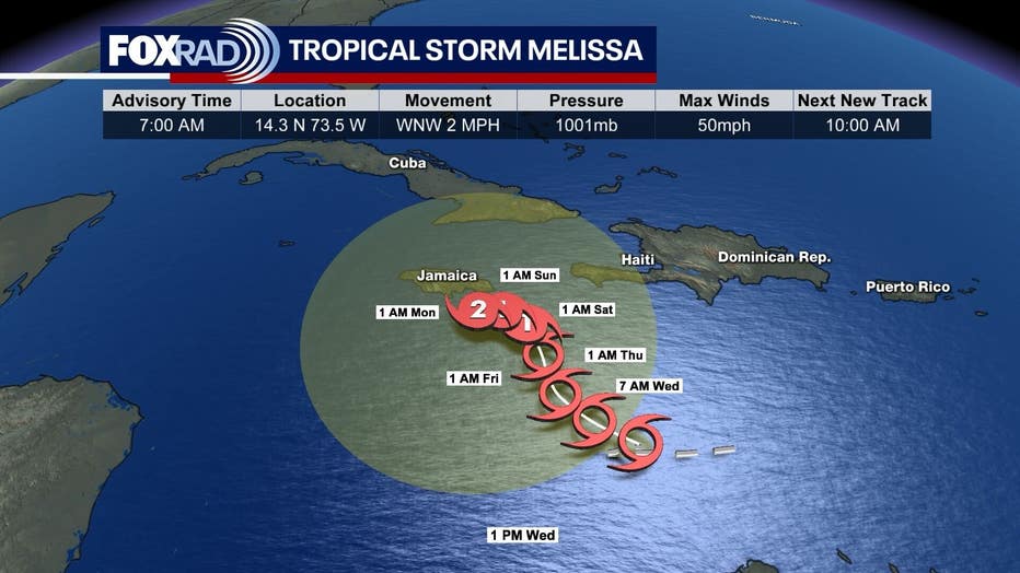 Tropical Storm Melissa has formed in the central Caribbean with sustained winds near 50 mph and is barely moving as of Wednesday morning.