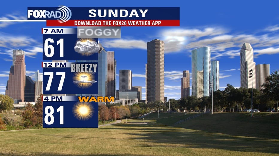 HOUSTON - Sunday will begin with pleasantly cool temps in the upper 50s along areas of dense fog, especially south of Houston and closer to the coast.