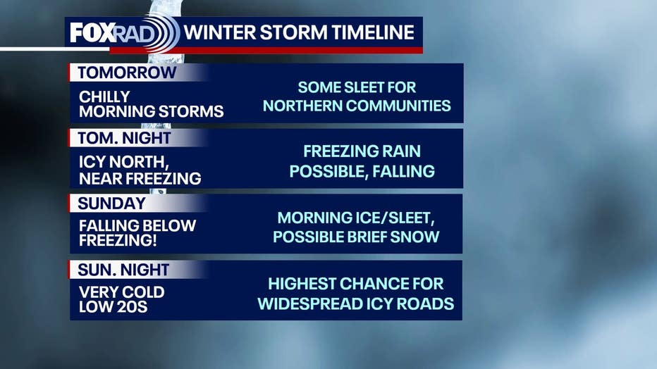 The exact timing of when temperatures fall below freezing still varies across computer models, but the coldest air and highest ice risk will arrive Saturday night, Sunday and Monday morning.