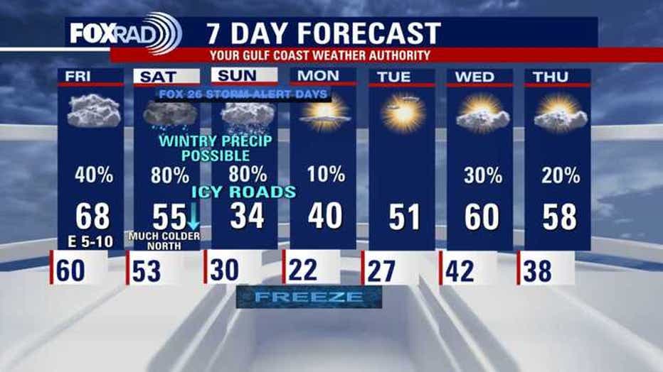 The greatest concern is the overlap of moisture and freezing temperatures late Saturday into Sunday, which could lead to freezing rain or sleet, especially north of Houston.
